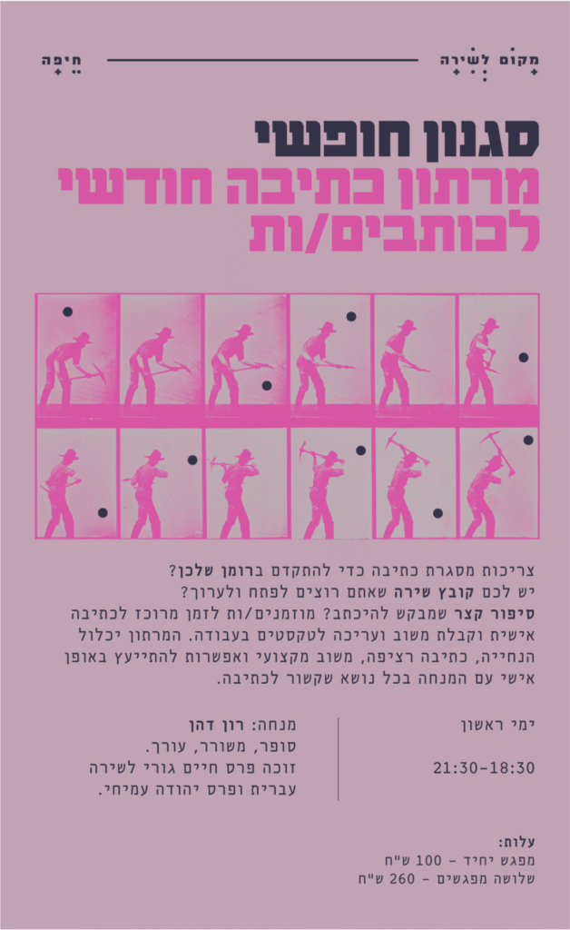 סגנון חופשי מרתון כתיבה חודשי לכותבים/ות במקום לשירה בחיפה אתם כותבים אבל בעצם לא כותבים? אתם אומרים לעצמכם שעכשיו זה לא הזמן? הדירה שלכם נקייה מדי? אז סגרנו לכם את הפינה. מרתון הכתיבה של מקום לשירה בולם תירוצים ודחיינות באמצעים לא אלימים. יום שלם, מהבוקר עד אחר הצהריים, יום המוקדש כולו לכתיבה ושיחה על כתיבה, […]