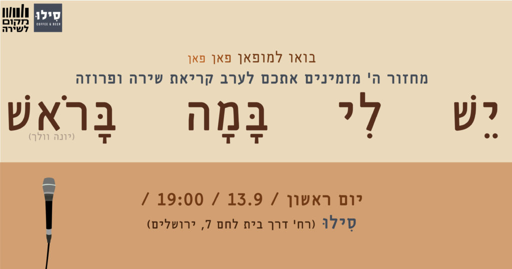 חוזרים למקום לשירה! פסטיבל וודסטוק שירה // חוגגים שירה עברית ביום העצמאות יום חמישי // 15.04.21 // 17:30-12:00 // רחוב המערבים 9, ירושלים אנחנו מזמינים אתכם ואתכן לחגוג יחד וקצת אחרת את יום העצמאות עם פסטיבל וודסטוק שירה! בפסטיבל נחגוג את ערכי השחרור והחופש של השירה העברית העכשווית, עם מיטב המשוררות והמשוררים שיחלקו איתנו משירתם. […]