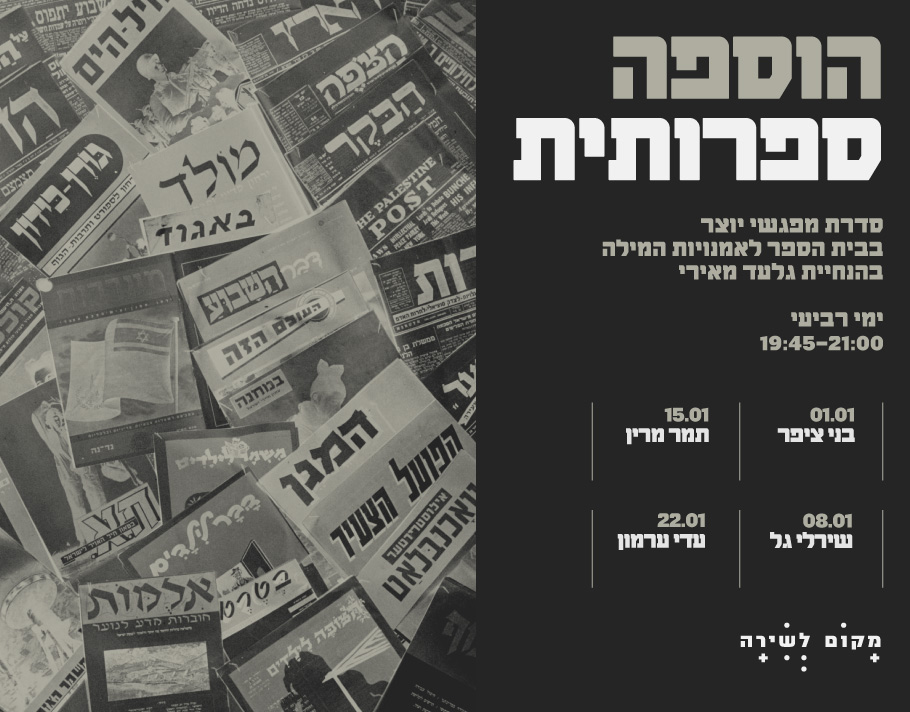 כרטיס כניסה לסדרת מפגשי יוצר: הוספה ספרותית ימי רביעי בינואר 1.1 – בני ציפר 8.1 – שירלי גל 15.1 – תמר מרין 22.1 – עדי ערמון